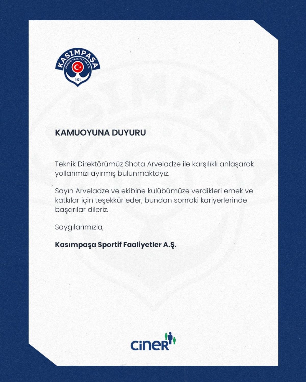 - Kasımpaşa, teknik direktör Şota Arveladze ile yollarını ayırdığını duyurdu.