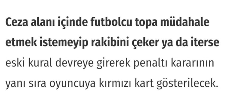 Ceza alanı içinde futbolcu topa müdahale etmek istemeyip rakibini çeker ya da iterse eski kural devreye girerek penaltı kararının yanı sıra oyuncuya kırmızı kart gösterilecek.