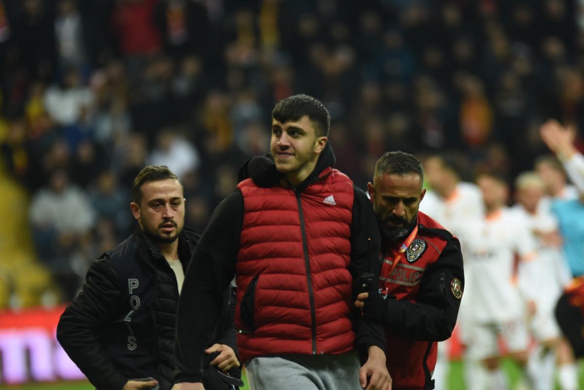 Sahaya giren taraftar, Muslera ile fotoğraf çektirmek isterken, bir başka taraftar ise sahaya girerek fotoğraf çektirmek isteyen taraftara saldırmak istedi.
