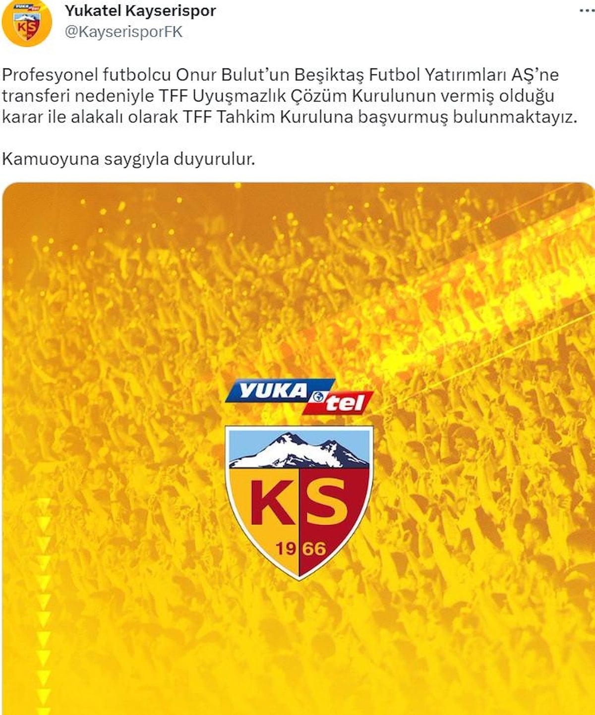 "Profesyonel futbolcu Onur Bulut’un Beşiktaş Futbol Yatırımları AŞ’ye transferi nedeniyle TFF Uyuşmazlık Çözüm Kurulunun vermiş olduğu karar ile alakalı olarak TFF Tahkim Kuruluna başvurmuş bulunmaktayız."