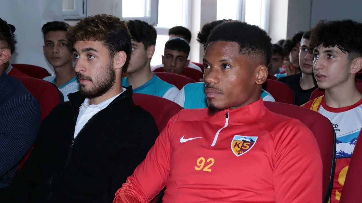 Somuncubaba Anadolu İmam Hatip Lisesi’nde öğrencilerle buluşan Kayserispor’lu futbolcular Kartal Kayra Yılmaz ve Julian Jeanvier, soruları yanıtlayarak forma imzaladı.