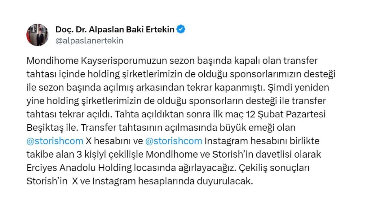 Erciyes Anadolu Holding CEO'su Alpaslan Baki Ertekin de sosyal paylaşım sitesindeki hesabından yasağın kalkması adına şirket olarak gereken desteği verdiklerini açıkladı.