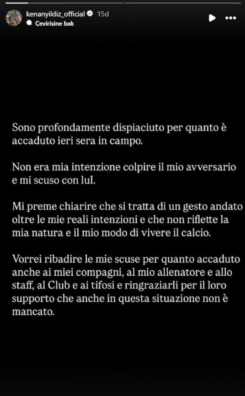 Juventus'un genç yıldızı Kenan Yıldız, Monza maçında gördüğü kırmızı kart sonrası hem rakibinden hem takımından özür diledi. Yıldız paylaşımında, "Dün akşam sahada yaşananlar nedeniyle derin üzüntü duyuyorum. Rakibime vurmak gibi bir niyetim yoktu ve ondan özür diliyorum" dedi.