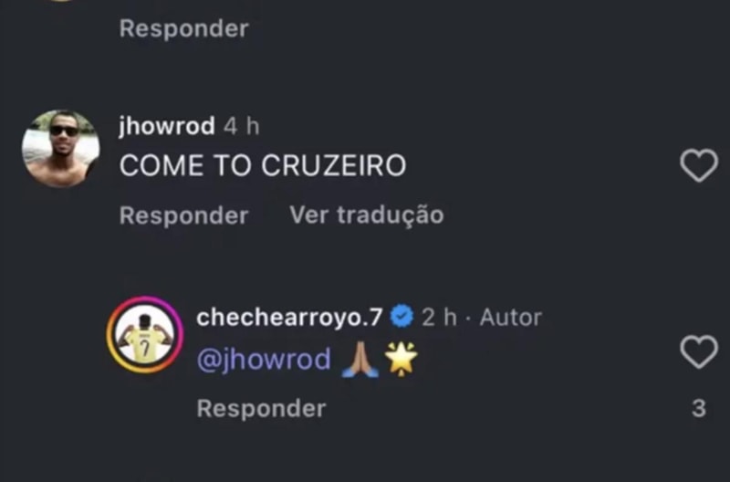 19 yaşındaki futbolcu, bir Cruzeiro taraftarının sosyal medyadan yaptığı "Cruzeiro'ya gel" yorumuna bir yıldız ve umarım emojisiyle karşılık verdi.