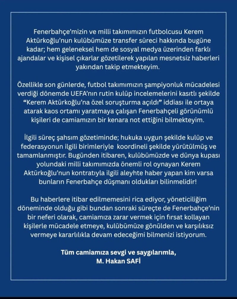 Fenerbahçe'mizin ve milli takımımızın futbolcusu Kerem Aktürkoğlu'nun kulübümüze transfer süreci hakkında bugüne kadar; hem geleneksel hem de sosyal medya üzerinden farklı ajandalar ve kişisel çıkarlar gözetilerek yapılan mesnetsiz haberleri yakından takip etmekteyim.
