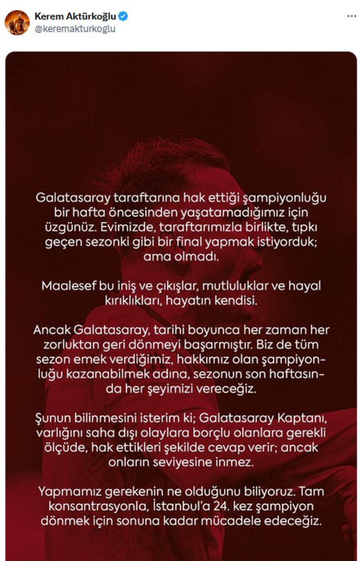 ''Galatasaray taraftarına hak ettiği şampiyonluğu bir hafta öncesinden yaşatamadığımız için üzgünüz. Evimizde, taraftarımızla birlikte, tıpkı geçen sezonki gibi bir final yapmak istiyorduk; ama olmadı.