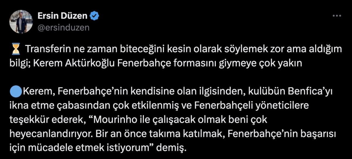 Kerem Aktürkoğlu’nun yöneticiler ile yaptığı konuşmayı açıklayan Ersin Düzen, "Kerem, Fenerbahçe’nin kendisine olan ilgisinden, kulübün Benfica’yı ikna etme çabasından çok etkilenmiş ve Fenerbahçeli yöneticilere teşekkür ederek, 'Mourinho ile çalışacak olmak beni çok heyecanlandırıyor. Bir an önce takıma katılmak, Fenerbahçe’nin başarısı için mücadele etmek istiyorum' demiş" ifadelerini kullandı.