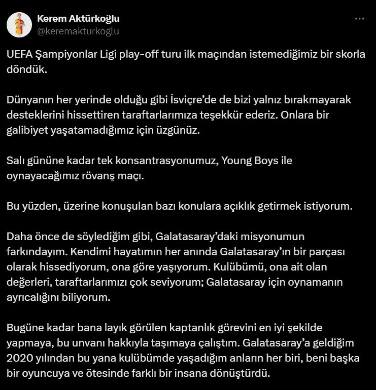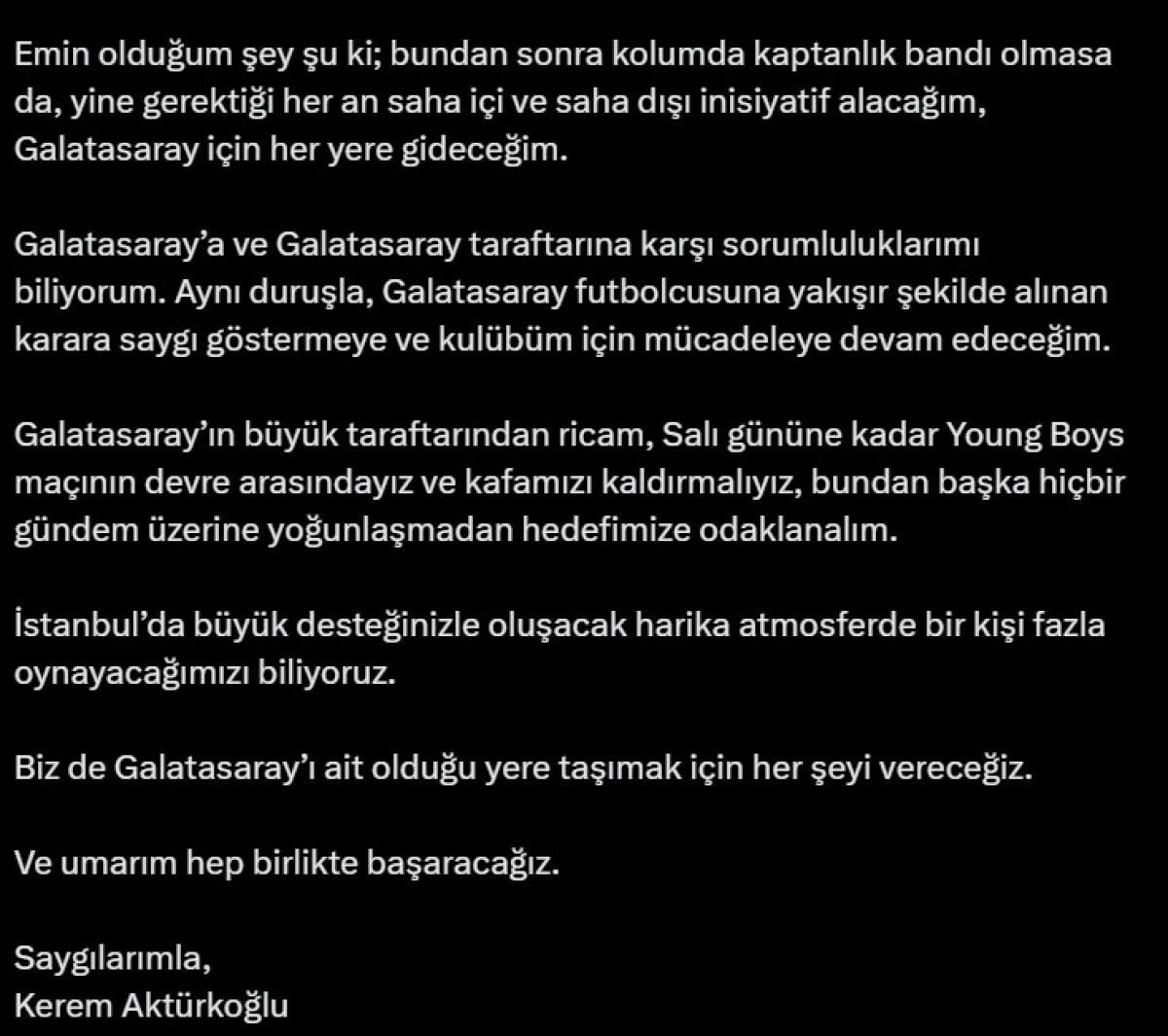 Kerem, yaptığı paylaşımda artık sarı-kırmızılıların kaptanlarından biri olmadığını ifade etti.
