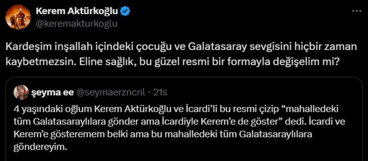Dört yaşındaki oğlum Kerem Aktürkoğlu ve Icardili bu resmi çizip 'Mahalledeki tüm Galatasaraylılara gönder ama Icardi'yle Kerem'e de göster.' dedi. Icardi ve Kerem'e gösteremem belki ama bu mahalledeki tüm Galatasaraylılara göndereyim.