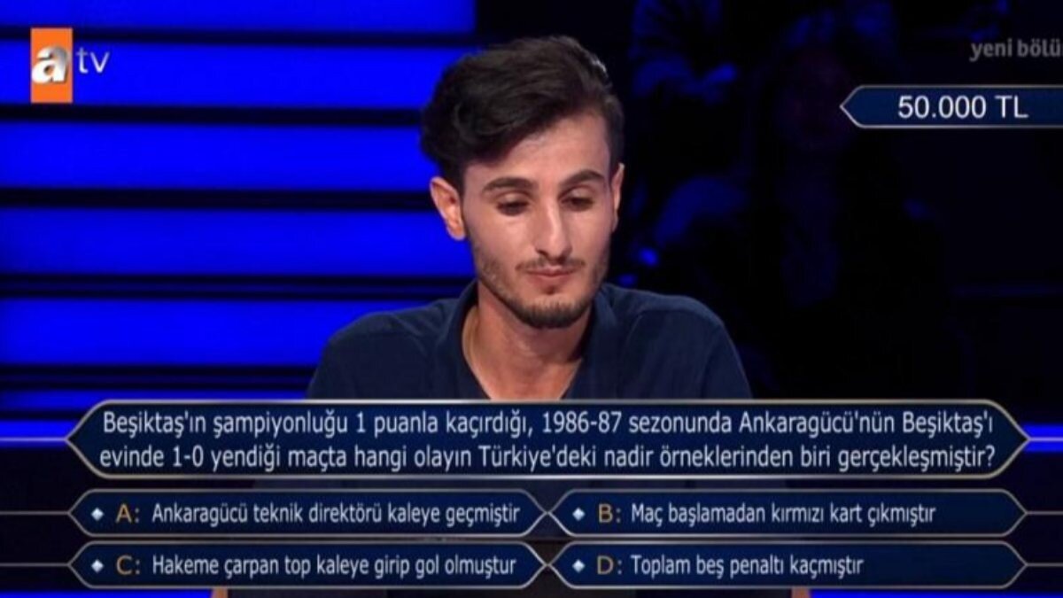 Kim Milyoner Olmak İster'de "Beşiktaş'ın şampiyonluğu 1 puanla kaçırdığı 1986-87 sezonunda Ankaragücü'nün Beşiktaş'ı 1-0 yendiği maçta hangi olayın Türkiye'deki nadir örneklerinden biri gerçekleşmiştir?" sorusu sosyal medyada geniş yer tuttu.