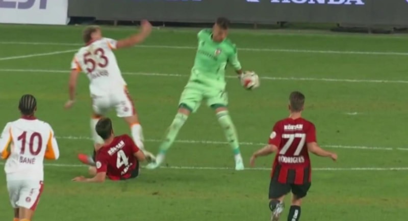 Galatasaraylı futbolcular, kaleci Burak'ın ceza sahası dışında elle oynadığı yönünde itirazda bulundu.