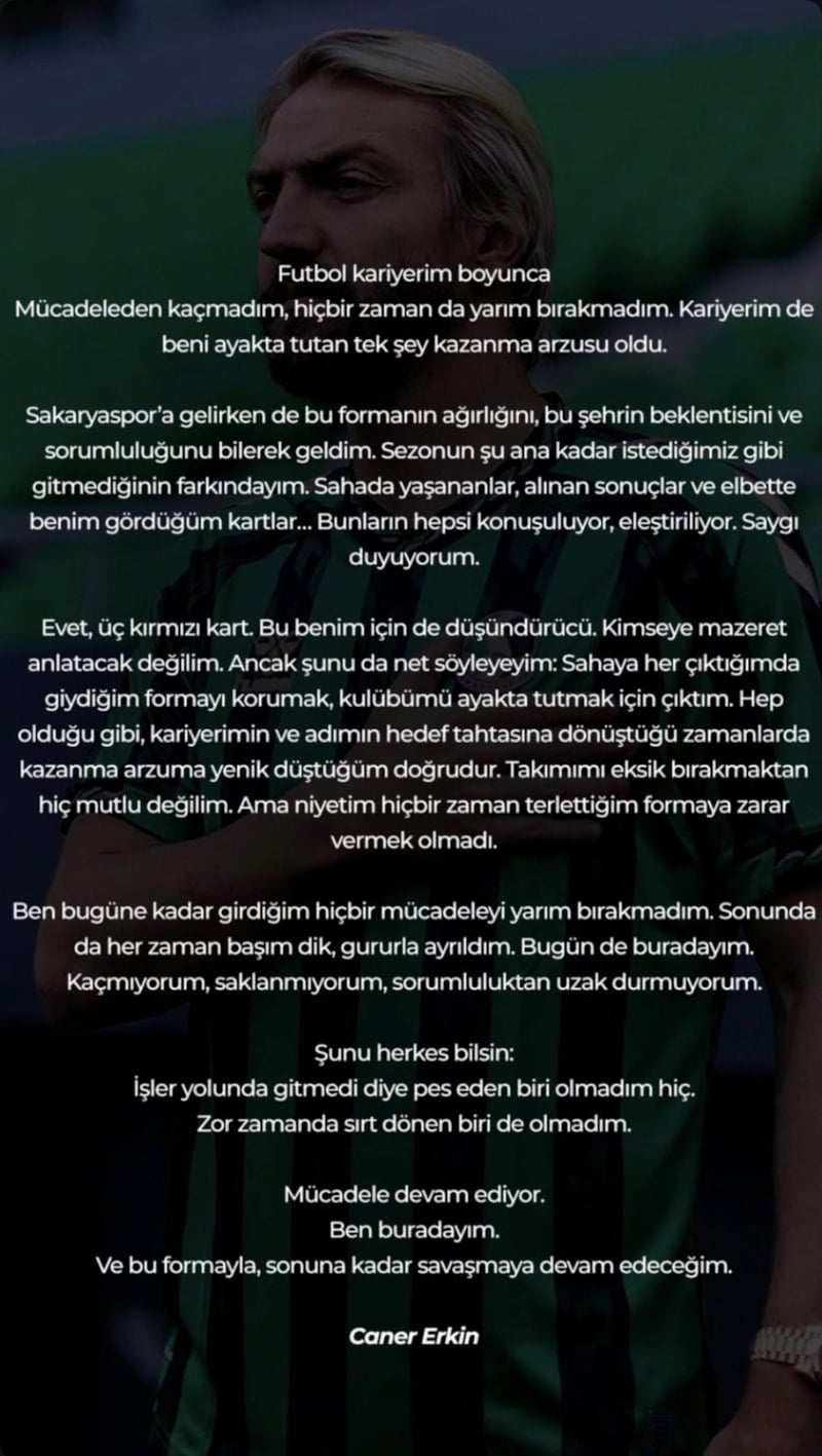 Caner Erkin, tepkilerin ardından sosyal medya hesabından bir paylaşım yaptı ve gördüğü kırmızı kartların kendisi için de düşündürücü olduğu vurgulayarak "Mücadele devam ediyor. Ben buradayım. Ve bu formayla, sonuna kadar savaşmaya devam edeceğim." ifadelerini kullandı.