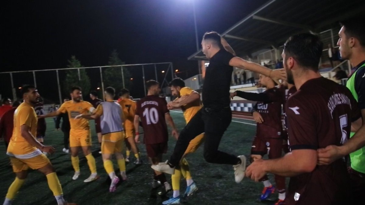 Derincesporlu futbolcu, yerdeki taraftara ardından tekme atarken, rakip futbolcu da olaya yine tekme atarak dahil oldu.