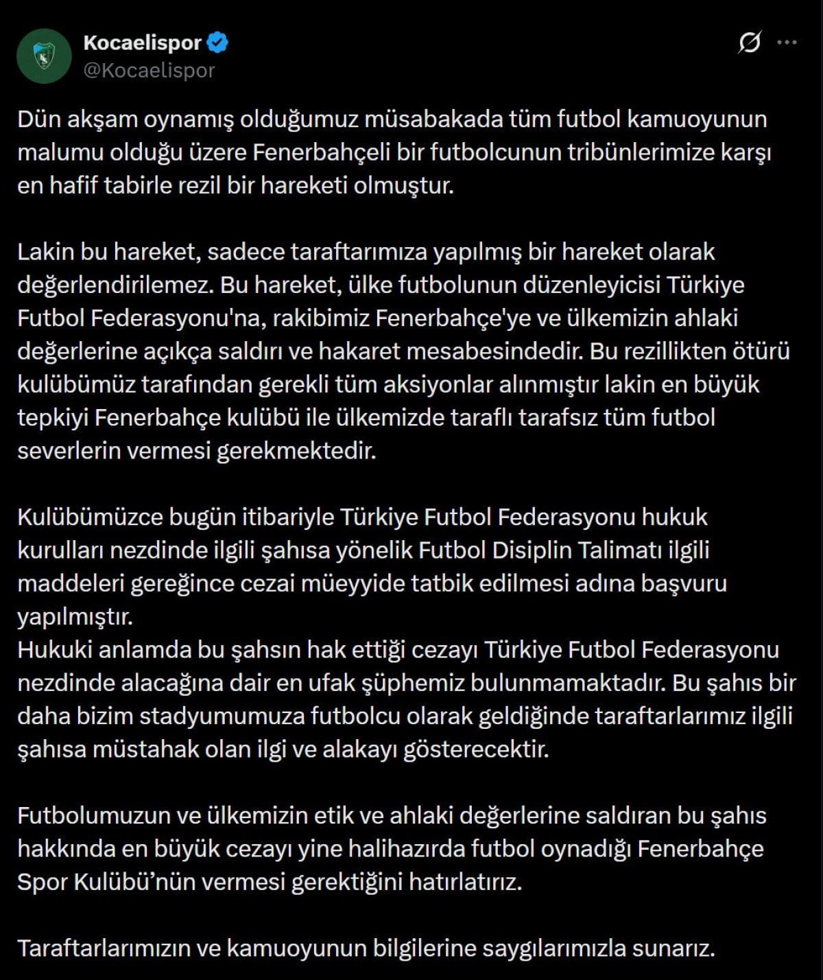 Kocaelispor Kulübü, Fenerbahçe'nin attığı golün ardından Kocaeli tribünlerine yönelik uygunsuz hareketler yapan Milan Skriniar'ın cezalandırılması için TFF'ye başvuruda bulunulduğunu açıkladı.