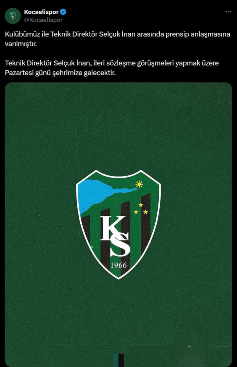 Süper Lig'e 16 yıl aradan sonra dönüş yapan Kocaelispor, teknik direktör Selçuk İnan ile prensipte anlaşmaya vardığını duyurdu.