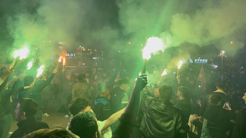 Ellerinde bayraklarla kutlama yapan taraftarlar, meşaleler yaktı.