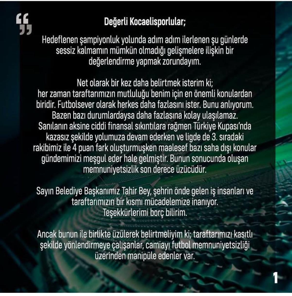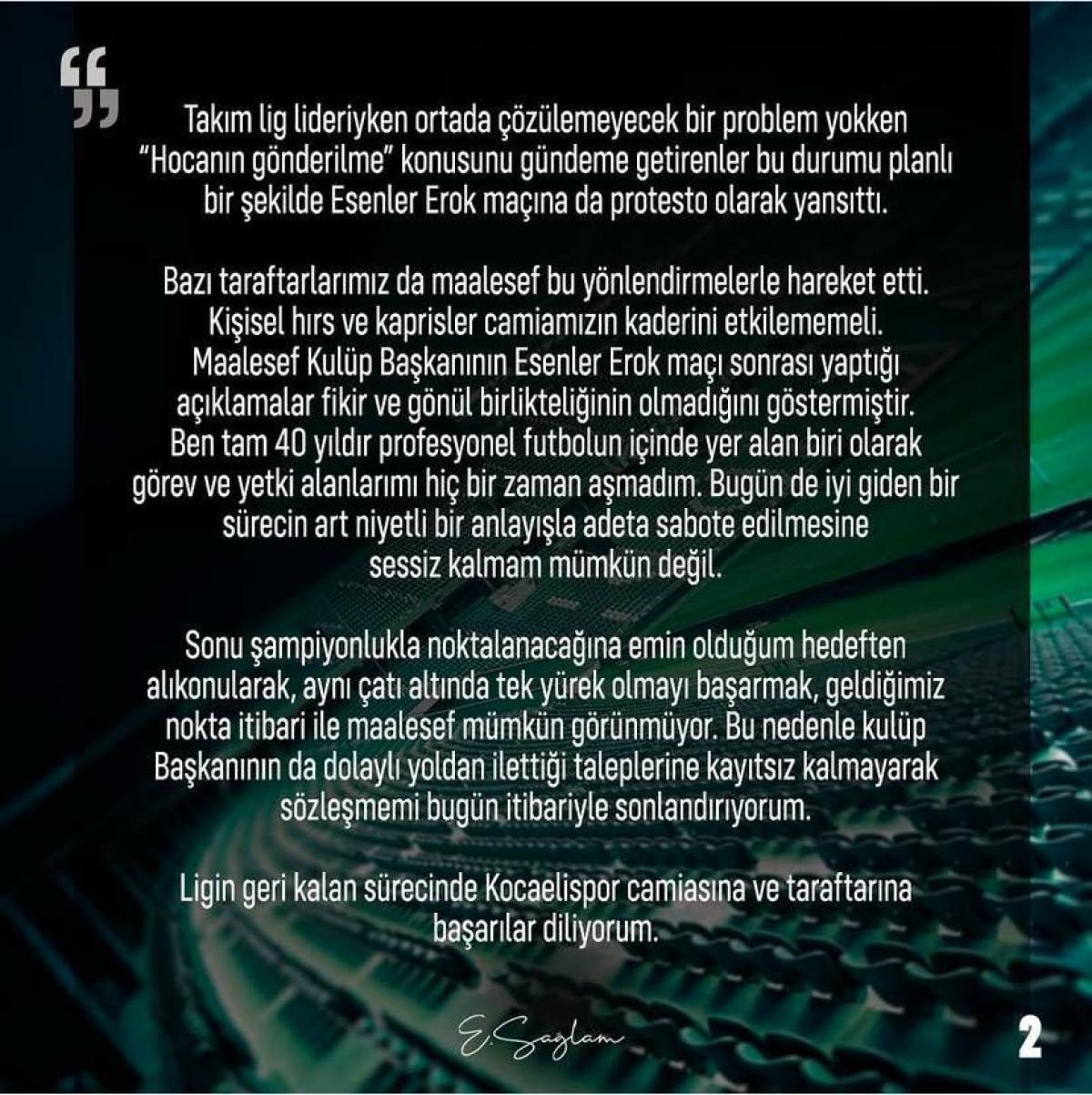 Ancak bununla birlikte üzülerek belirtmeliyim ki; taraftarımızı kasıtlı şekilde yönlendirmeye çalışanlar, camiayı futbol memnuniyetsizliği üzerinden manipüle edenler var. Takım lig lideriyken ortada çözülemeyecek bir problem yokken 'Hocanın gönderilme' konusunu gündeme getirenler bu durumu planlı bir şekilde Esenler Erok maçına da protesto olarak yansıttı. Bazı taraftarlarımız da maalesef bu yönlendirmelerle hareket etti. Kişisel hırs ve kaprisler camiamızı etkilememeli. Maalesef Kulüp Başkanının Esenler Erok maçı sonrası yaptığı açıklamalar fikir ve gönül birlikteliğinin olmadığını göstermiştir. Ben tam 40 yıldır profesyonel futbolun içinde yer alan biri olarak görev ve yetki alanlarımı hiç bir zaman aşmadım. Bugün de iyi giden bir sürecin art niyetli bir anlayışla adeta sabote edilmesine sessiz kalmam mümkün değil. Sonu şampiyonlukla noktalanacağına emin olduğum hedeften alıkonularak, aynı çatı altında tek yürek olmayı başarmak, geldiğimiz nokta itibariyle maalesef mümkün görünmüyor. Bu nedenle kulüp Başkanının da dolaylı yoldan ilettiği taleplerine kayıtsız kalmayarak sözleşmemi bugün itibariyle sonlandırıyorum. Ligin geri kalan sürecinde Kocaelispor camiasına ve taraftarına başarılar diliyorum.