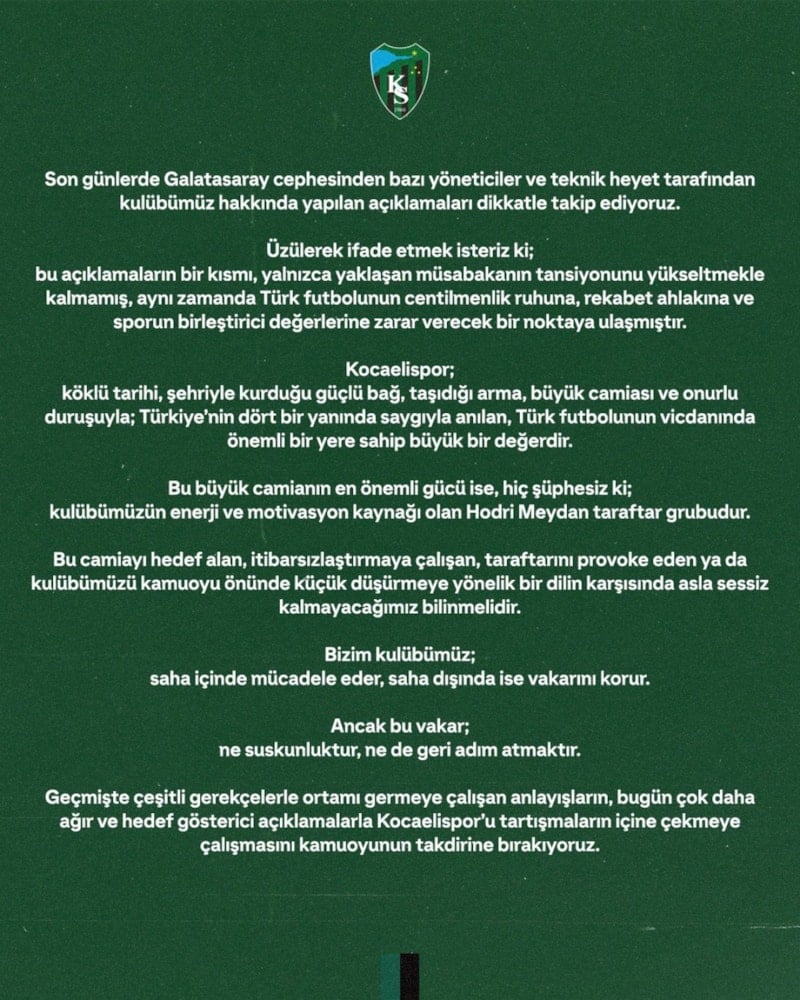 Süper Lig ekiplerinden Kocaelispor, Süper Lig'de bu hafta sonu oynayacakları Galatasaray maçı öncesi çok sert bir açıklama yaptı.