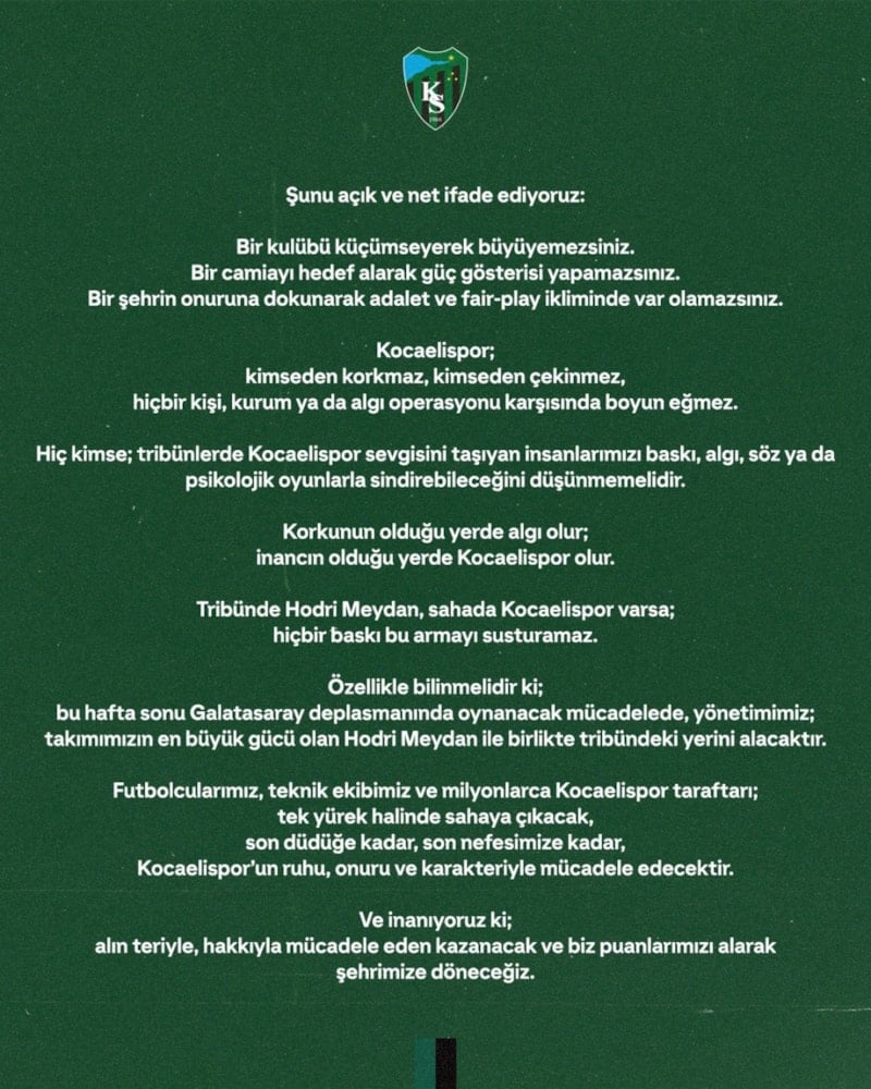 Hiç kimse; tribünlerde Kocaelispor sevgisini taşıyan insanlarımızı baskı, algı, söz ya da psikolojik oyunlarla sindirebileceğini düşünmemelidir.
