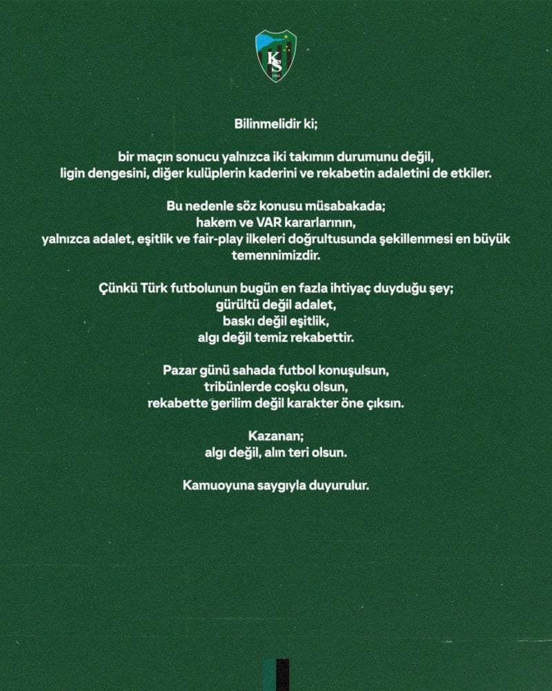 Bu nedenle söz konusu müsabakada; hakem ve VAR kararlarının, yalnızca adalet, eşitlik ve fair-play ilkeleri doğrultusunda şekillenmesi en büyük temennimizdir.