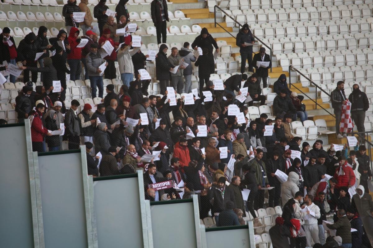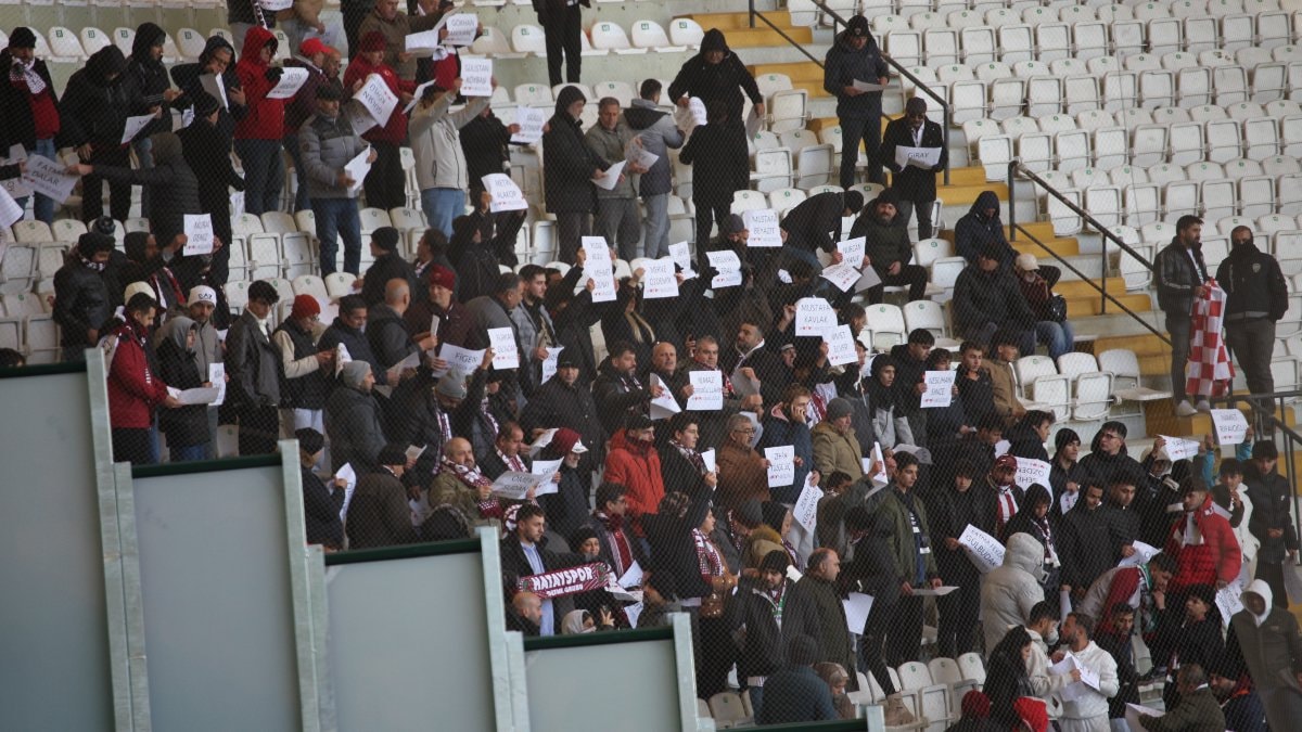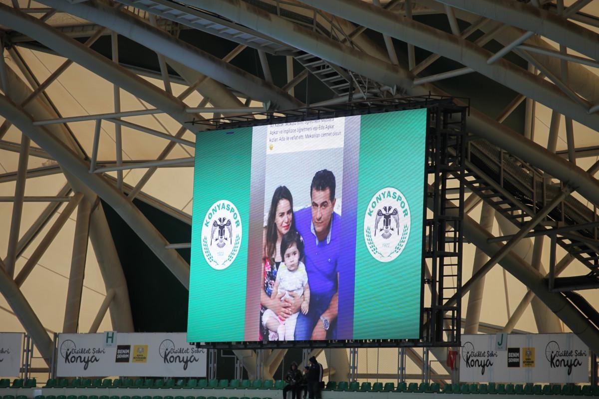Vefat eden öğretmenlerin fotoğrafları ekranlarda gösterilirken, Hatayspor taraftarı ise öğretmenlerin adı yazılı pankart hazırladı.
