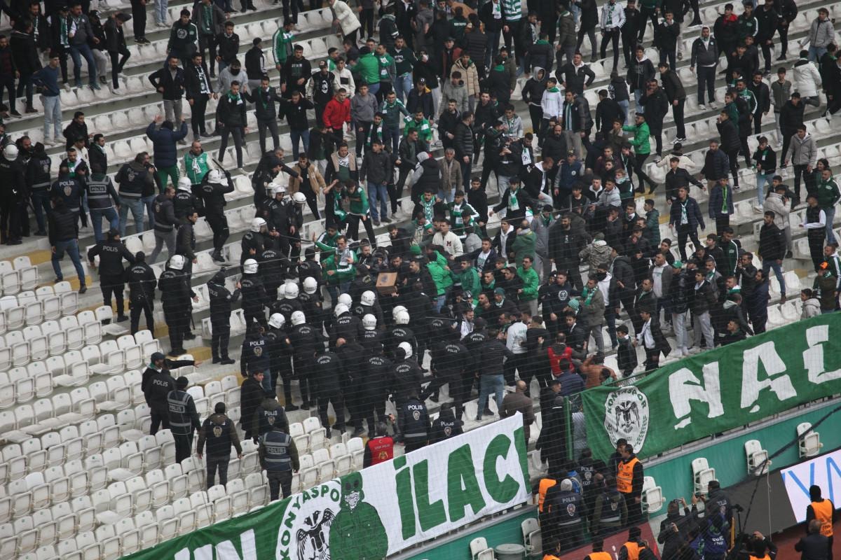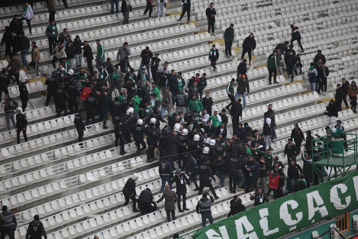 Müdahale esnasında bazı taraftarlar tribündeki koltukları atarken, polis ekipleri de taraftarları stadyumdan çıkardı.