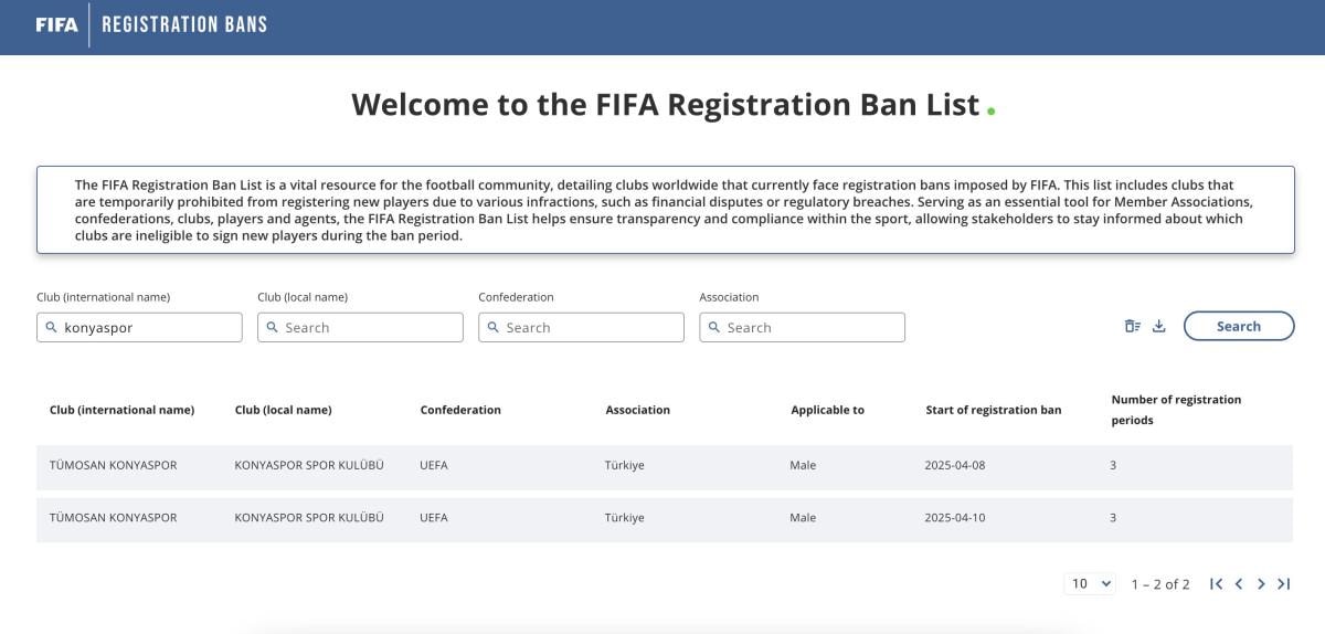 FIFA'nın internet sitesinde yer alan bilgiye göre; Konyaspor, 10 Nisan 2025 başlangıç tarihinden itibaren 3 dönem transfer yasağı cezası aldı.