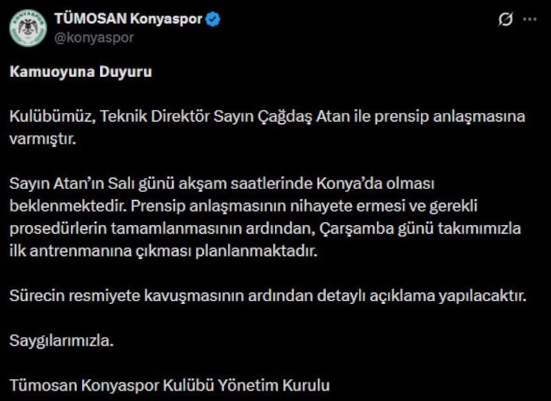 "Kulübümüz, Teknik Direktör Sayın Çağdaş Atan ile prensip anlaşmasına varmıştır. Sayın Atan’ın Salı günü akşam saatlerinde Konya’da olması beklenmektedir. Prensip anlaşmasının nihayete ermesi ve gerekli prosedürlerin tamamlanmasının ardından, Çarşamba günü takımımızla ilk antrenmanına çıkması planlanmaktadır. Sürecin resmiyete kavuşmasının ardından detaylı açıklama yapılacaktır. Saygılarımızla."