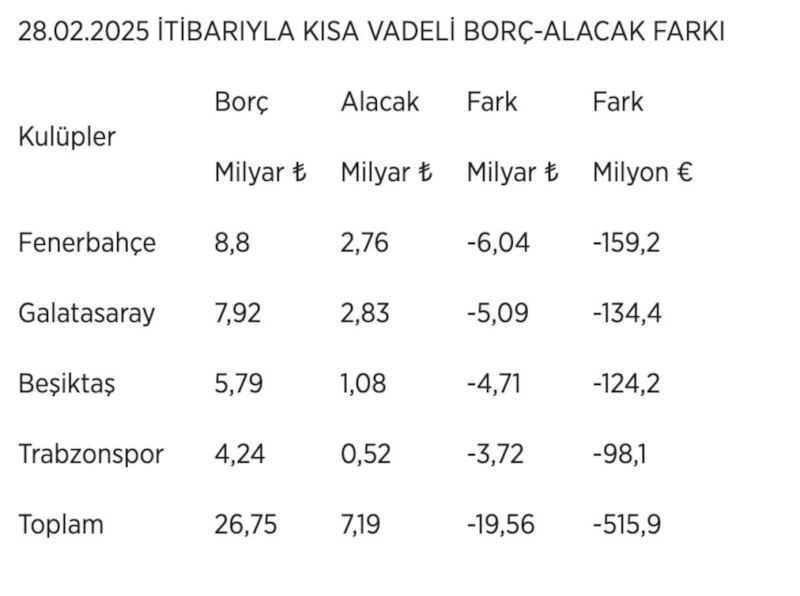 Kulüplerin 28 Şubat 2025 itibarıyla Bankalar Birliği'ne olan borçları şöyle: