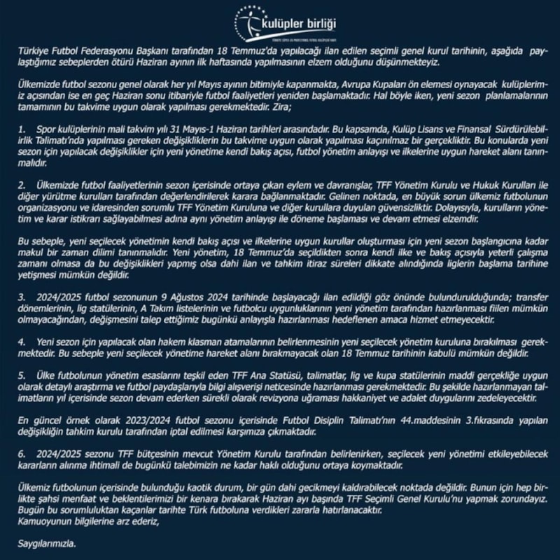 Yaşanan bu gelişmeler üzerine Kulüpler Birliği, Türkiye Futbol Federasyonu (TFF) seçimleriyle ilgili açıklama yayımlayarak, seçimin haziran ayının ilk haftası yapılması gerektiğine vurgu yaptı.