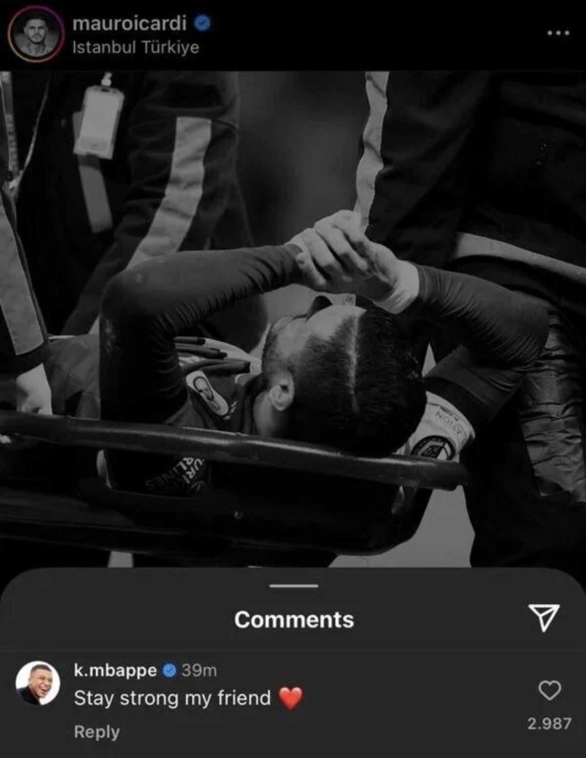 Icardi ile birlikte Paris Saint-Germain'de birlikte forma giyen Mbappe, golcü oyuncunun sakatlığıyla ilgili yaptığı açıklamanın altında "Güçlü kal dostum" yorumu yaptı.