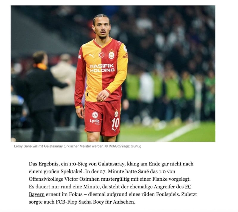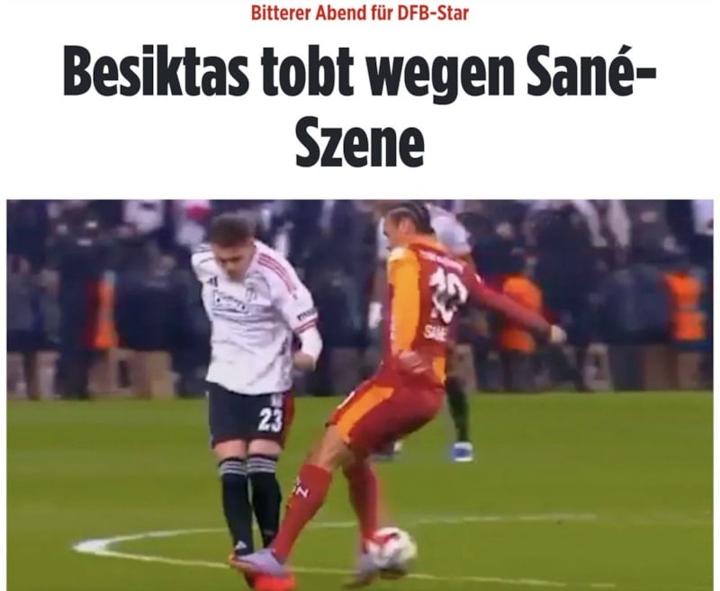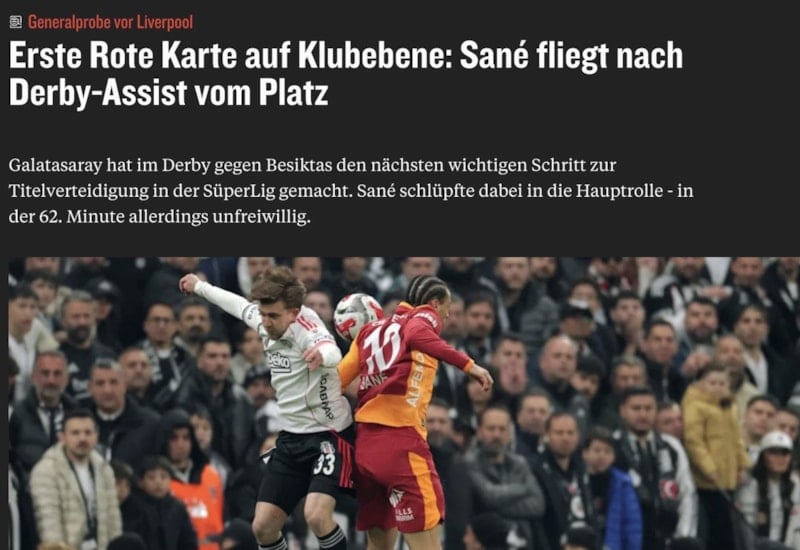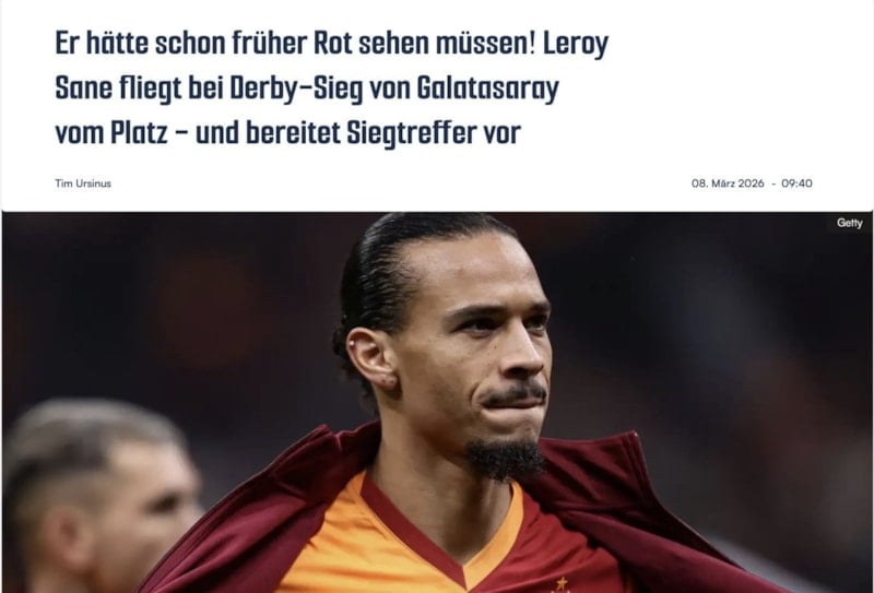 Galatasaray'ın Beşiktaş'ı deplasmanda 1-0 mağlup ettiği derbide kırmızı kart gören Leroy Sane, ülkesinde eleştiri oklarının hedefi oldu. Yıldız oyuncunun daha önce atılması gerektiği ifade edilirken 'Sane için İstanbul derbisi utanç verici bir şekilde sona erdi' yorumu yapıldı.