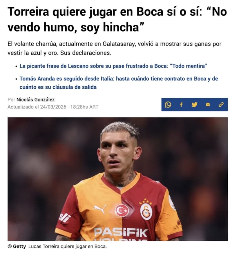 Boca Juniors'ta oynama arzusunu dile getiren 30 yaşındaki Lucas Torreira, "Sadece laf olsun diye konuşmuyorum. Galatasaray'ın önemli bir oyuncusu olarak, Boca'ya gelmek istediğimi söylediğimde nasıl bir tepki alacağımı düşünüyorsunuz? Boca'da oynamak istediğimi söylüyorum ve bu sözümün arkasındayım. Ben bir taraftarım ve en büyük idolüm Tevez." ifadelerini kullandı.