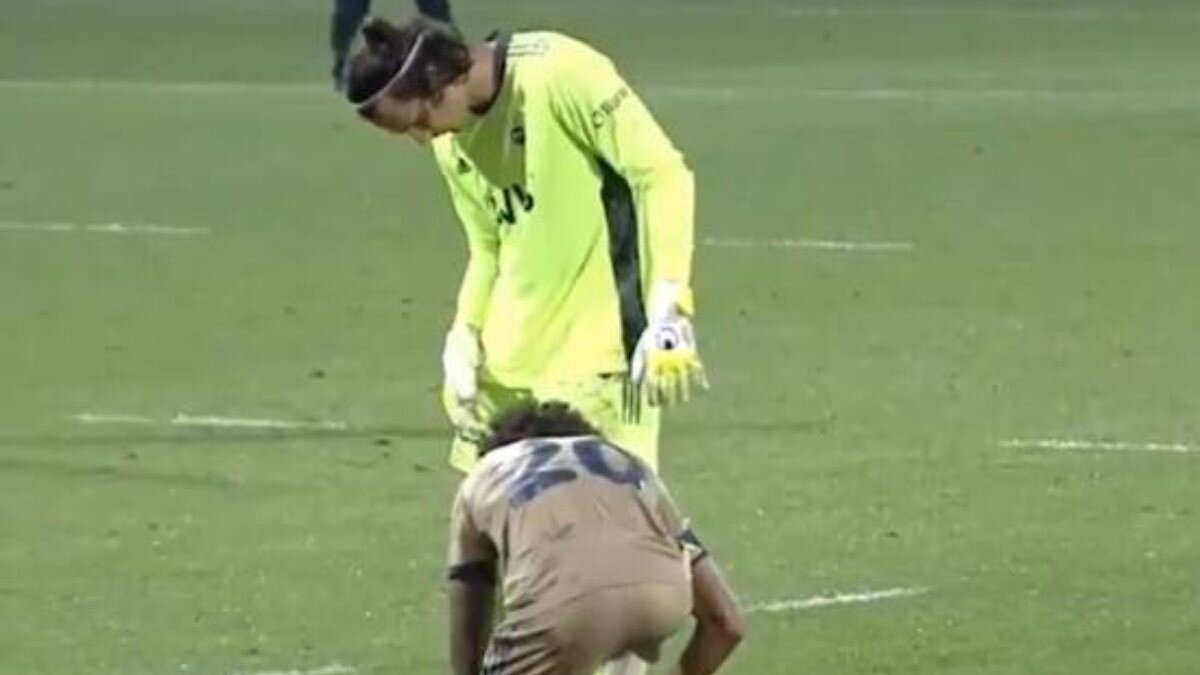 GENÇ KALECİNİN AYAKKABISINI BAĞLADI