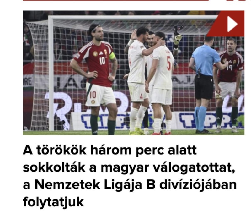 "Türkler, Macar Milli Takımını üç dakikada şok etti, Milletler Ligi B Grubu'nda devam ediyoruz. Macaristan Milli Futbol Takımı, Milletler Ligi A Grubu elemelerinde Türkiye'ye 3-0 yenilerek, toplamda 6-1'lik skorla B Grubu'na düştü."