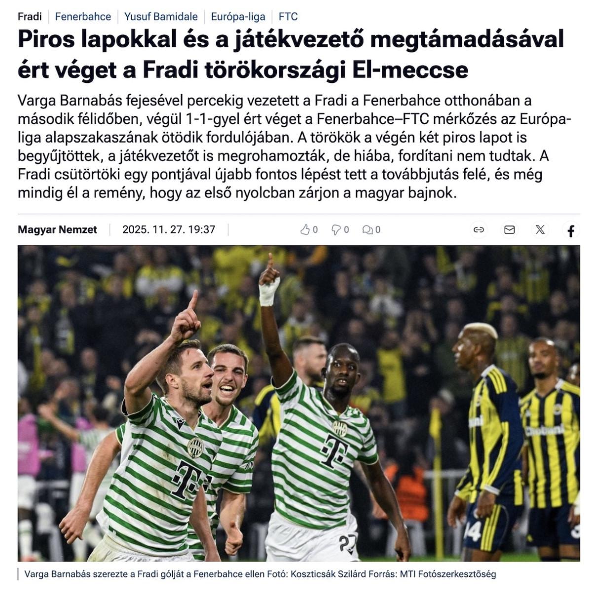 "Ferencvaros, kahramanca bir mücadelenin ardından İstanbul cehenneminde bir puan kazandı. Fanatik Türkler'in çıkardığı gürültü acı verici derecede yüksekti. Maç öncesi Fenerbahçeli futbolcuların tanıtıldığı an, sanki dünyanın en büyük rock yıldızları sıraya girmiş gibiydi. 1-1'lik skor, İstanbul cehenneminde harika bir sonuçtu."