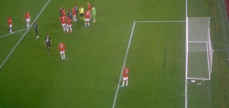 Bu anlarda Alejandro Garnacho ise penaltı noktasına geldi ve beyaz noktayı kazımaya başladı. Penaltı atışı için topu alan Jordan Larsson vuruş yapmadan önce penaltı noktası tahrip edilmişti.