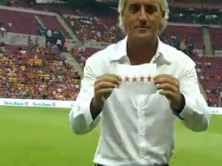 Galatasaraylı oyuncular ellerindeki 4 yıldızlı kağıdı Mancini'ye vererek İtalyan çalıştırıcıya sürpriz yaptılar. Roberto Mancini ise yapılan jesti kameralara gösterdi.