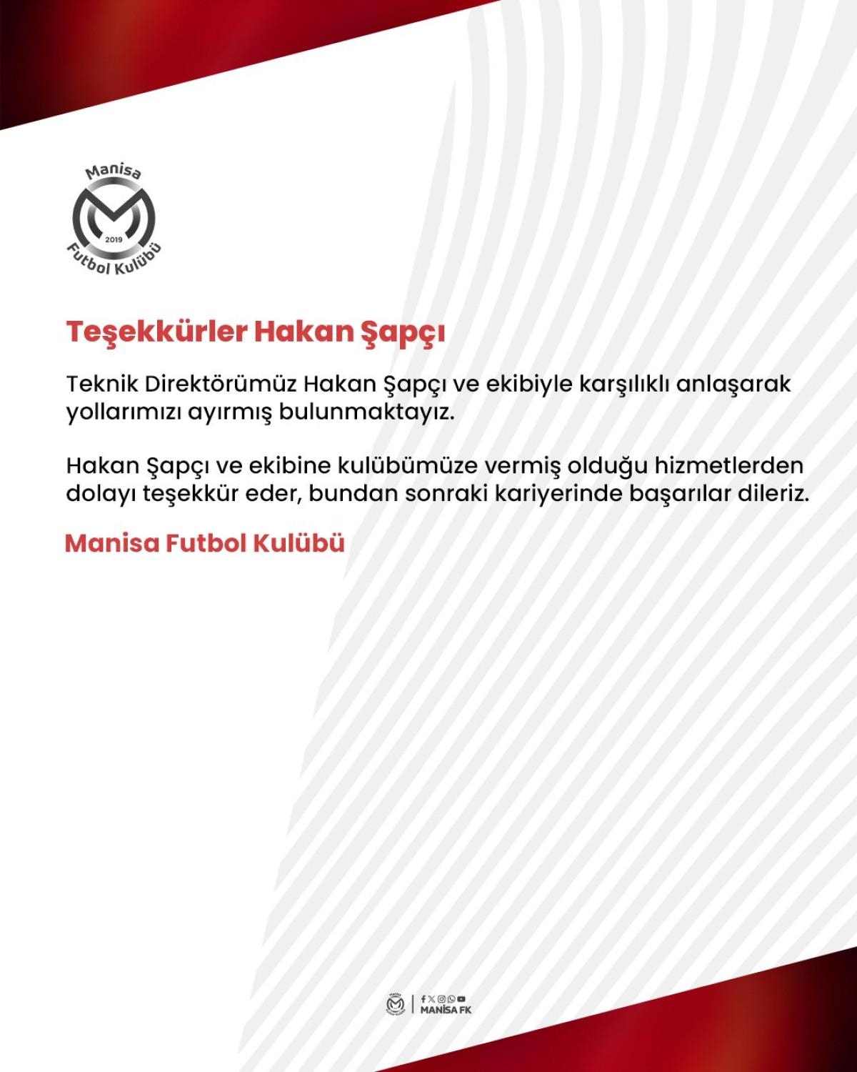 1. Lig ekiplerinden Manisa FK’da kötü gidişatın faturası, Teknik Direktör Hakan Şapçı’ya kesildi.