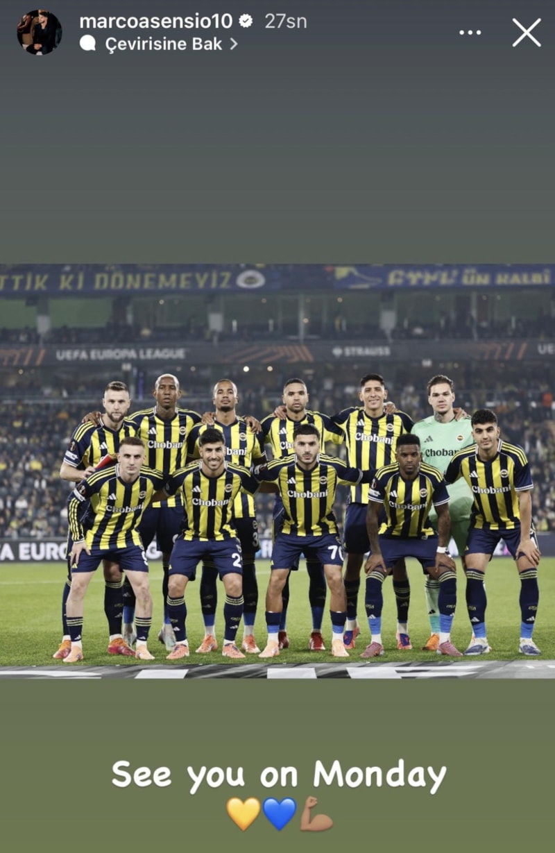 Sezon başında katıldığı Fenerbahçe'de kısa süre içerisinde taraftarın sevgilisi olan Marco Asensio, takım arkadaşlarıyla maç önü fotoğrafını kullandığı paylaşımına, "Pazartesi görüşürüz." notunu düştü.