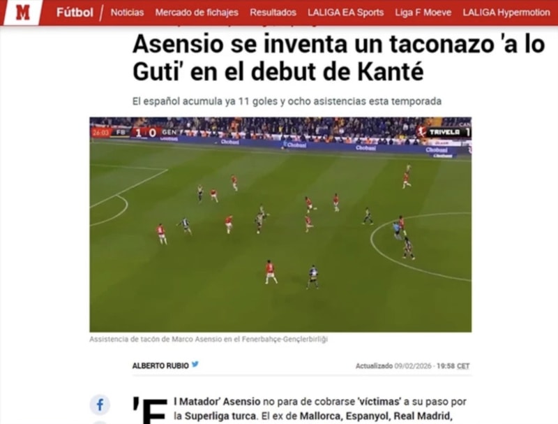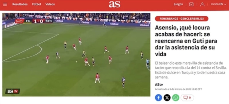Marca'da yer alan haberde, "El Matador' Asensio, Süper Lig’deki yolculuğunda adeta önüne geleni 'avlamaya' devam ediyor. Mallorca, Espanyol, Real Madrid, PSG ve Aston Villa’nın eski oyuncusu olan yıldız isim, Fenerbahçe’nin Gençlerbirliği’ni 3-1 mağlup ettiği maçta bu kez 'Guti tarzı' topuk pasıyla yaptığı asistle yine belirleyici oldu." denildi.