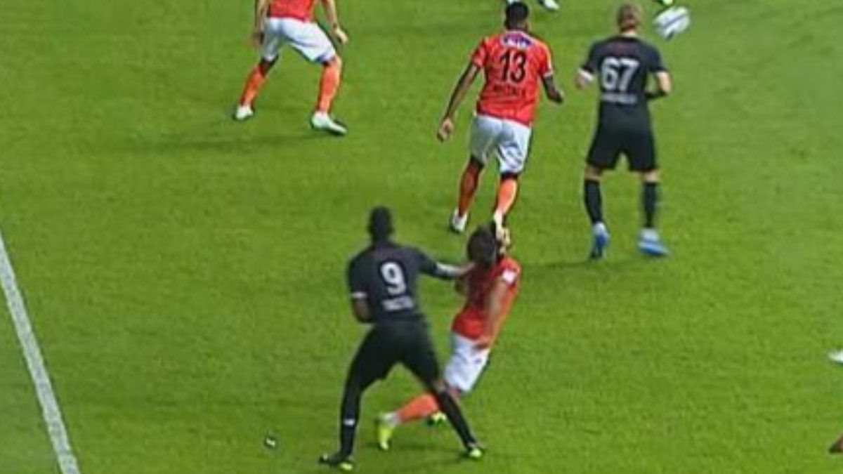 Adana Demirspor'un santrforu Mario Balotelli, mücadelenin 7. dakikasında Yeni Malatyaspor'un savunma oyuncusu Sadık Çiftpınar'ın saçını çekerek yere düşürdü.