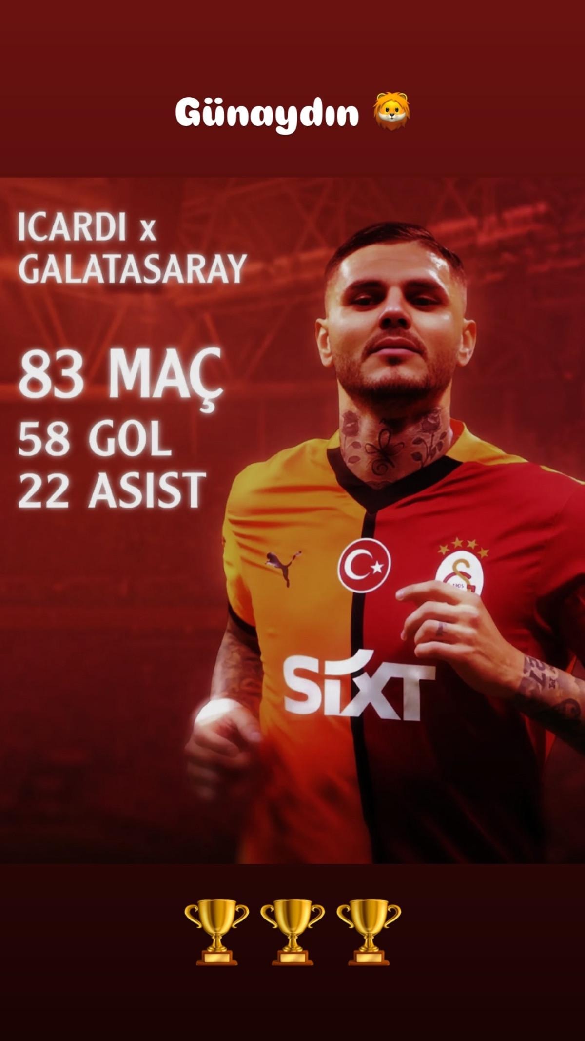 Sosyal medyadan bir görsel paylaşan Icardi, "Günaydın" yazdı ve Galatasaray'daki performansı ve kupalarını bu görselde kullandı.