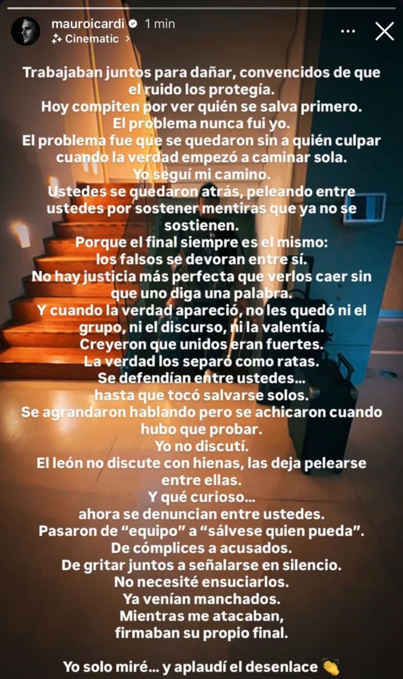 Icardi paylaşımında, "Zarar vermek için birlikte çalışıyorlardı, gürültünün onları koruduğuna ikna olmuşlardı. Bugün ise ilk kimin kurtulduğunu görmek için yarışıyorlar. Sorun hiçbir zaman ben değildim.