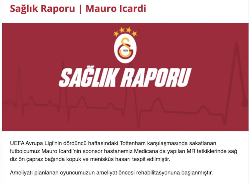UEFA Avrupa Ligi'nin dördüncü haftasındaki Tottenham karşılaşmasında sakatlanan futbolcumuz Mauro Icardi'nin MR tetkiklerinde sağ diz ön çapraz bağında kopuk ve menisküs hasarı tespit edilmiştir.