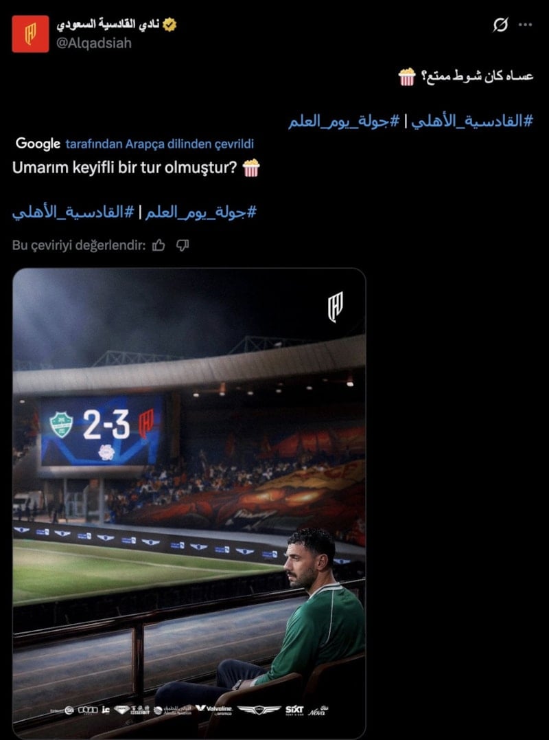 Maçın bitiş düdüğüyle birlikte Al Qadsiah resmi hesabından göndermeli bir paylaşım yapıldı.