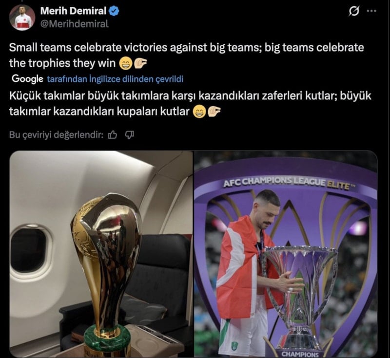Suudi Arabistan Pro Ligi'nde Al Qadsiah'ın Al Ahli'yi 3-2 mağlup ettiği maçın ardından Al Qadsiah'tan, Merih Demiral'a yönelik göndermeli bir paylaşım geldi. Merih ise cevap olarak "Küçük takımlar büyük takımlara karşı zaferlerini kutlar" yanıtını verdi.