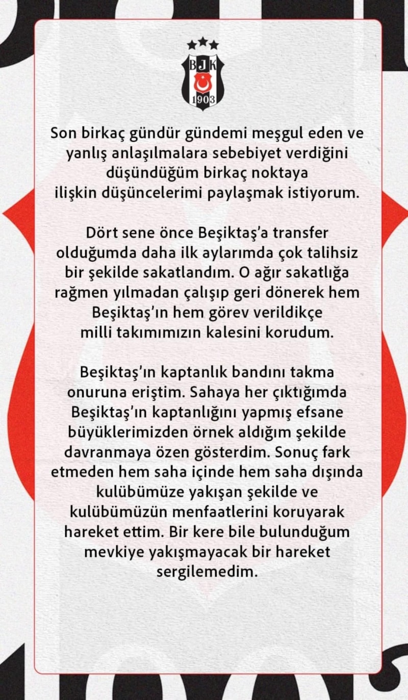 Son birkaç gündür gündemi meşgul eden ve yanlış anlaşılmalara sebebiyet verdiğini düşündüğüm birkaç noktaya ilişkin düşüncelerimi paylaşmak istiyorum. Dört sene önce Beşiktaş'a transfer olduğumda daha ilk aylarımda çok talihsiz bir şekilde sakatlandım. O ağır sakatlığa rağmen yılmadan çalışıp geri dönerek hem Beşiktaş'ın hem görev verildikçe milli takımımızın kale sini korudum. Beşiktaş'ın kaptanlık bandını takma onuruna eriştim. Sahaya her çıktığımda Beşiktaş'ın kaptanlığını yapmış efsane büyüklerimizden örnek aldığım şekilde davranmaya özen gösterdim. Sonuç fark etmeden hem saha içinde hem saha dışında kulübümüze yakışan şekilde ve kulübümüzün menfaatlerini koruyarak hareket ettim. Bir kere bile bulunduğum mevkiye yakışmayacak bir hareket sergilemedim. Bu sezona takım olarak iyi başlamadık. Beşiktaş'a yakışır oyunu sahaya yansıtamadığımız için en fazla üzülenlerden biriyim. Futbol bir takım oyunu ve bu kötü gidişata hep birlikte son verebilmek için elimizden geleni yapıyoruz. Bu süreçte yaşanan kaptanlık değişikliğini de her zaman olduğu gibi olgunlukla karşıladım. Beşiktaş çok köklü bir camiadır ve bu tür aksiyonlar, kurumsal yapının gerektirdiği şekilde alınır. Kariyerimin hiçbir zamanında alınan teknik ve yönetimsel kararlara ilişkin yorum yapmadım. Her türlü karara saygı duydum, bundan sonra da saygı duyacağım. Oynadığım zaman elimden geleni sahaya yansıtıp, oynamadığım zaman da oynayan arkadaşımı destekleyeceğim. Kulübümüze yakışır bir performansla sahada olmamız için elimden gelen tüm çabayı sarf etmeye devam edeceğim.