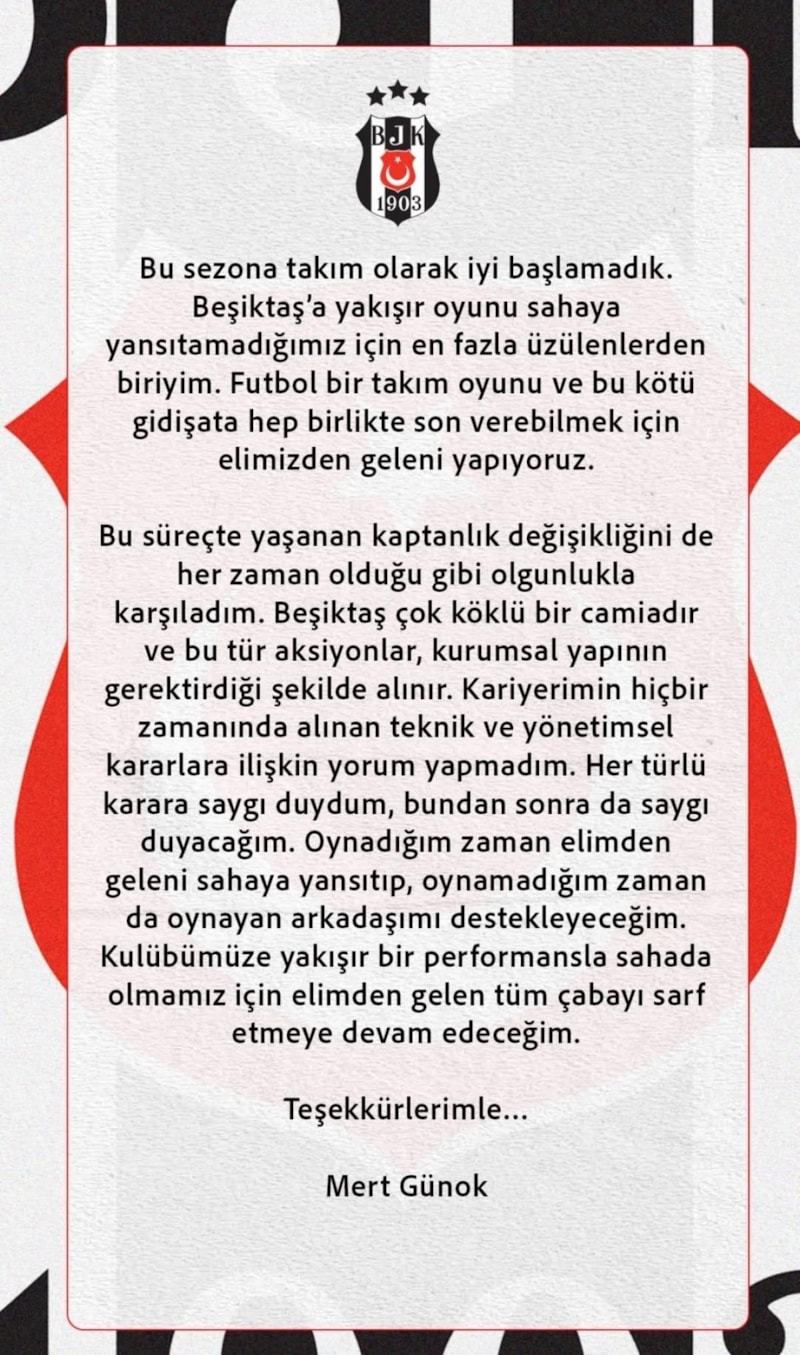 Necip Uysal ile birlikte kaptanlığı elinden alınan Mert Günok, yaşanan bu gelişmenin ardından sosyal medya hesabından bir açıklama yayınladı.