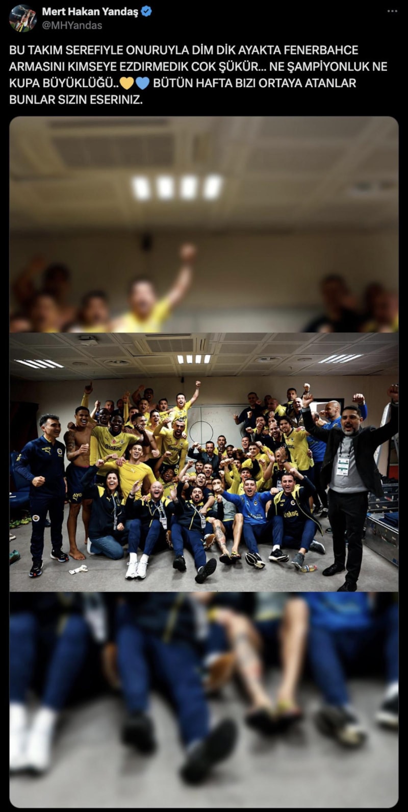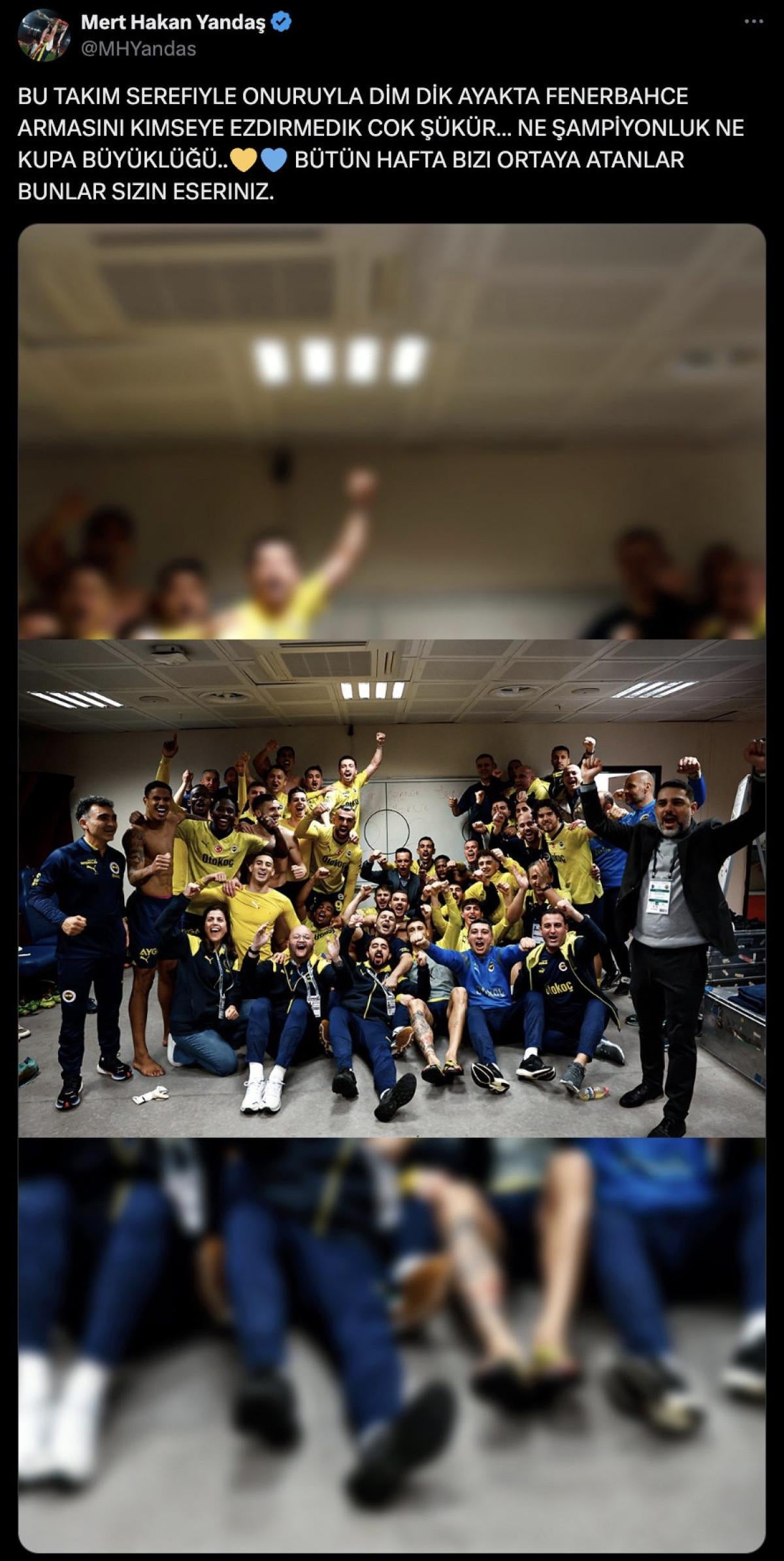 Mert Hakan Yandaş, karşılaşmanın ardından yaptığı paylaşımda takımla birlikte kutlama fotoğrafını koyarak, "Bu takım şerefiyle, onuruyla, dimdik ayakta. Fenerbahçe armasını kimseye ezdirmedik çok şükür. Ne şampiyonluk ne kupa büyüklüğü... Bütün hafta bizi ortaya atanlar, bunlar sizin eseriniz" notunu yazdı.